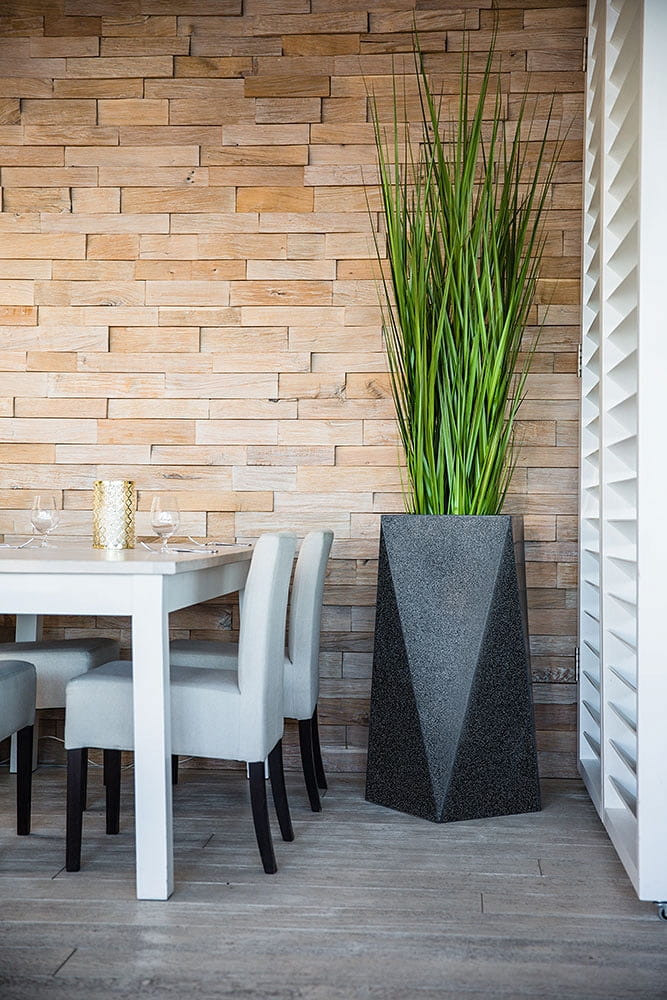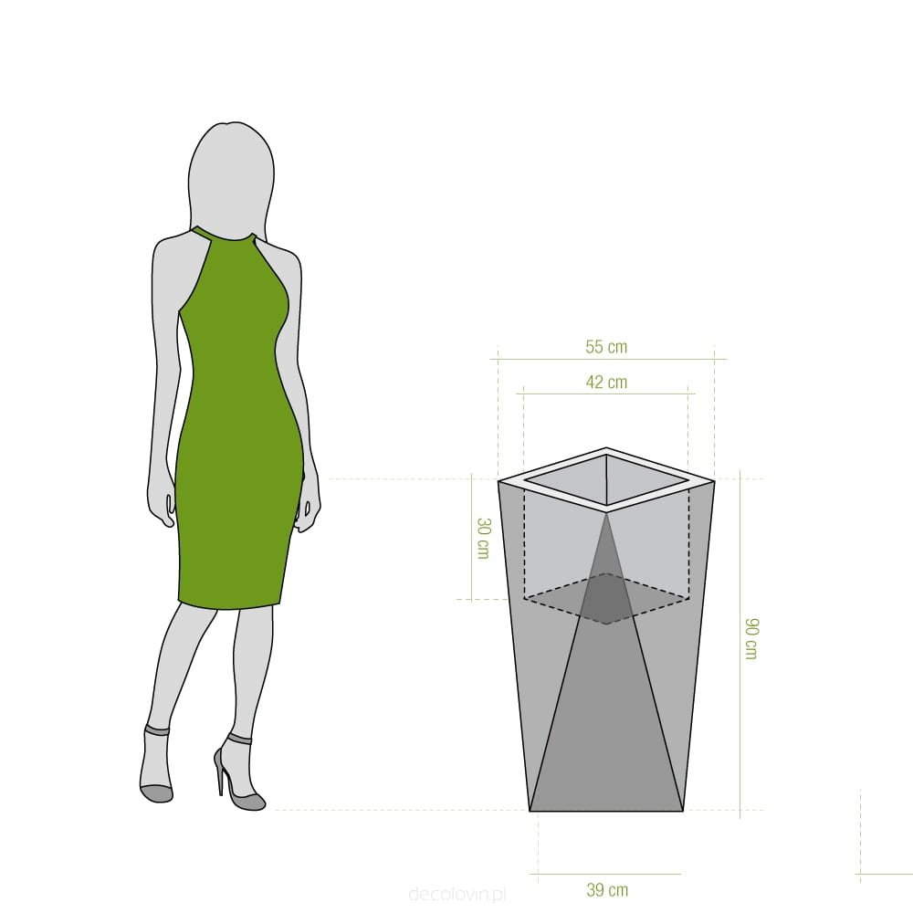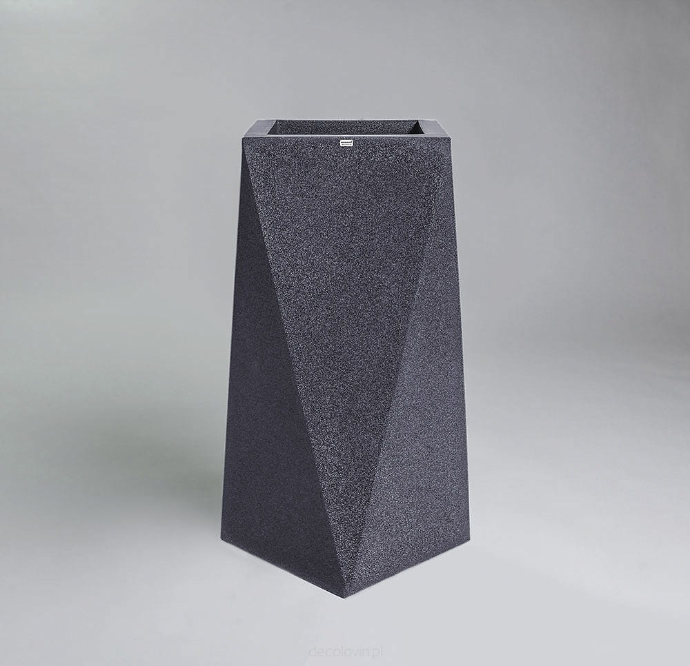 Duża donica o oryginalnym, geometrycznym kształcie. Jej ostre krawędzie sprawią, że charakter wystroju nabierze gustownej i nowoczesnej formy. Marka Decolovin proponuje imitujące ciemny marmurek donice Nevis o wysokości 90 cm wykonane z najwyższej jakości materiałów, gwarantujących ich trwałość i wytrzymałość. Produkt ten znajdzie zastosowanie nie tylko jako tradycyjna donica, ale także unikatowy, awangardowy element dekoracyjny zarówno wnętrz, jak i przestrzeni zielonych.