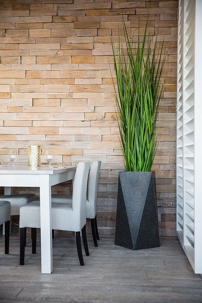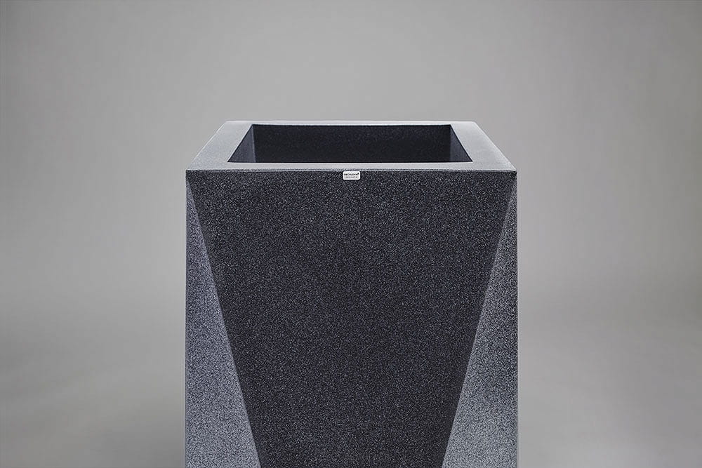 Duża donica o oryginalnym, geometrycznym kształcie. Jej ostre krawędzie sprawią, że charakter wystroju nabierze gustownej i nowoczesnej formy. Marka Decolovin proponuje imitujące ciemnymarmurek donice Nevis o wysokości 75 cm wykonane z najwyższej jakości materiałów, gwarantujących ich trwałość i wytrzymałość. Produkt ten znajdzie zastosowanie nie tylko jako tradycyjna donica, ale także unikatowy, awangardowy element dekoracyjny zarówno wnętrz, jak i przestrzeni zielonych.