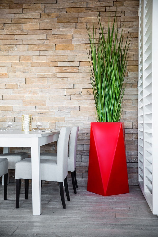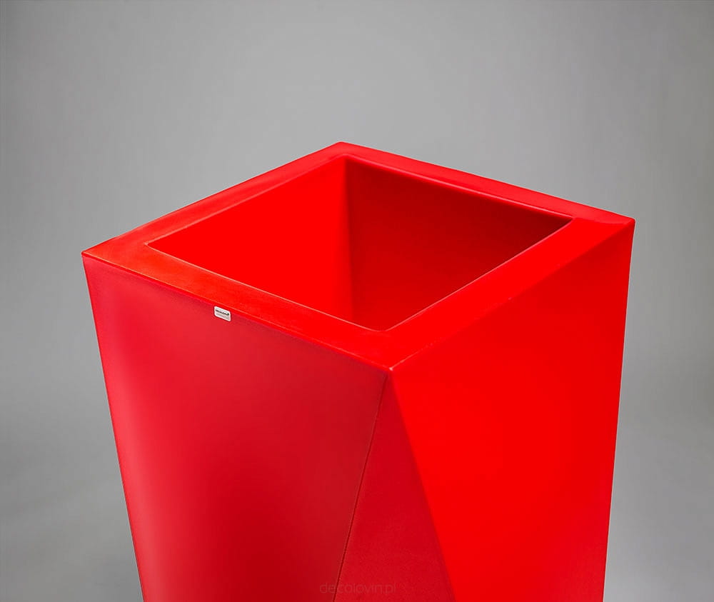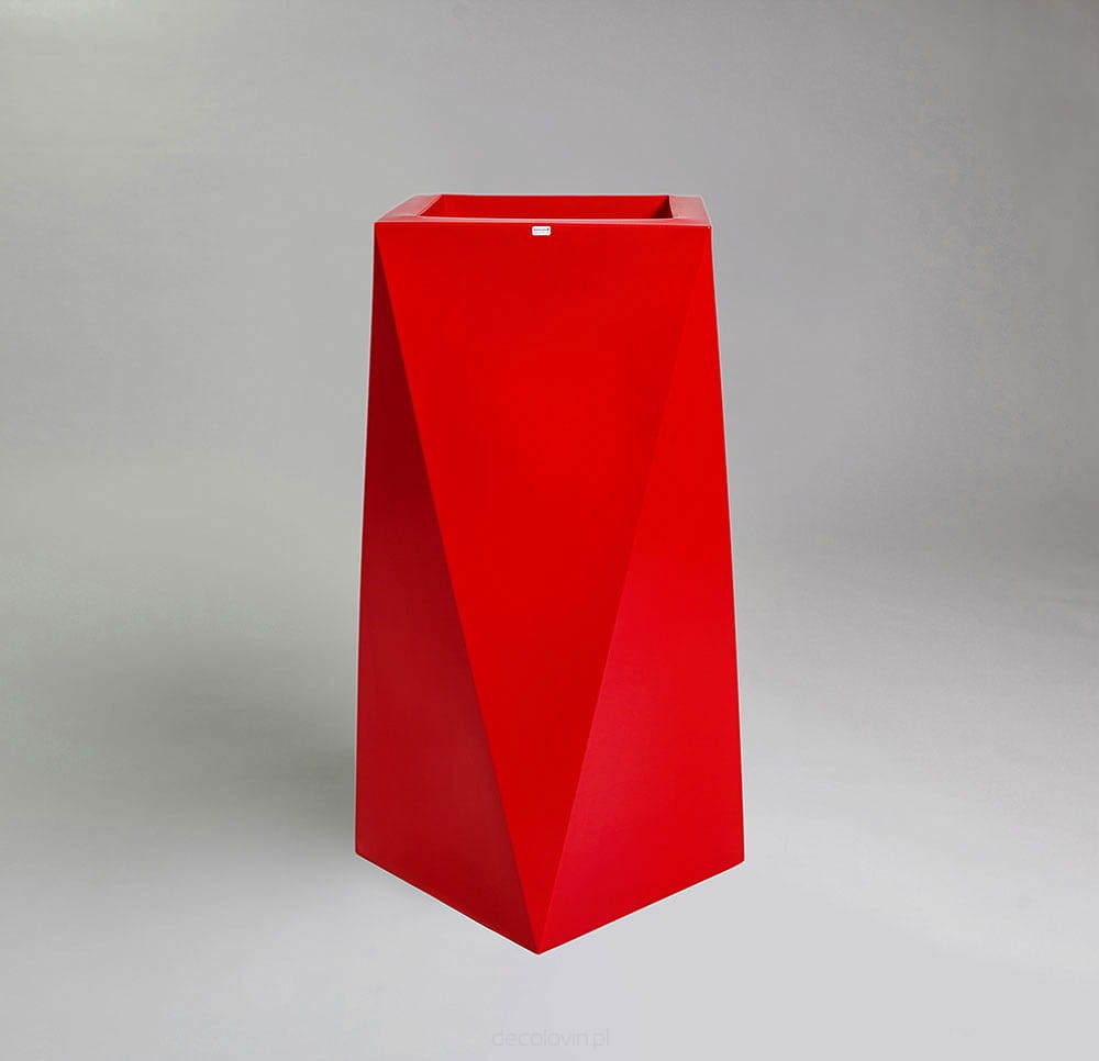 Duża donica o oryginalnym, geometrycznym kształcie. Jej ostre krawędzie sprawią, że charakter wystroju nabierze gustownej i nowoczesnej formy. Marka Decolovin proponuje czerwone donice Nevis o wysokości 75 cm wykonane z najwyższej jakości materiałów, gwarantujących ich trwałość i wytrzymałość. Produkt ten znajdzie zastosowanie nie tylko jako tradycyjna donica, ale także unikatowy, awangardowy element dekoracyjny zarówno wnętrz, jak i przestrzeni zielonych.