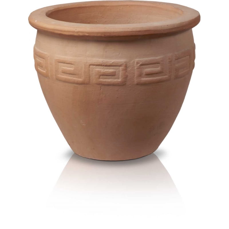 Okrągła donica ogrodowa, wykonana z terakoty i utrzymana w toskańskim stylu.