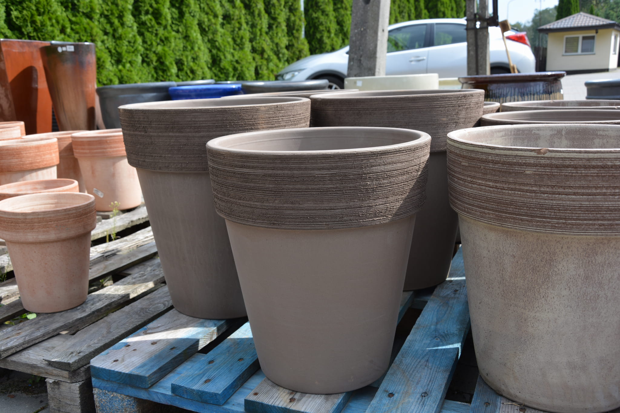 Włoska donica ogrodowa o okrągłej podstawie wykonana z terakoty.