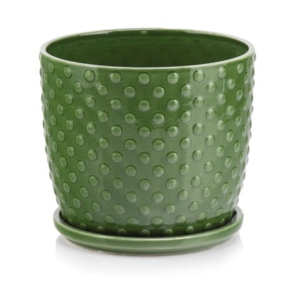 Błyszcząca powierzchnia dodaje blasku, a wypukłe kropeczki tworzą subtelną, dekoracyjną teksturę, nadając donicy unikalny charakter. To połączenie elegancji i tradycyjnych wzorów sprawia, że donica idealnie komponuje się z klasycznym wystrojem wnętrz.