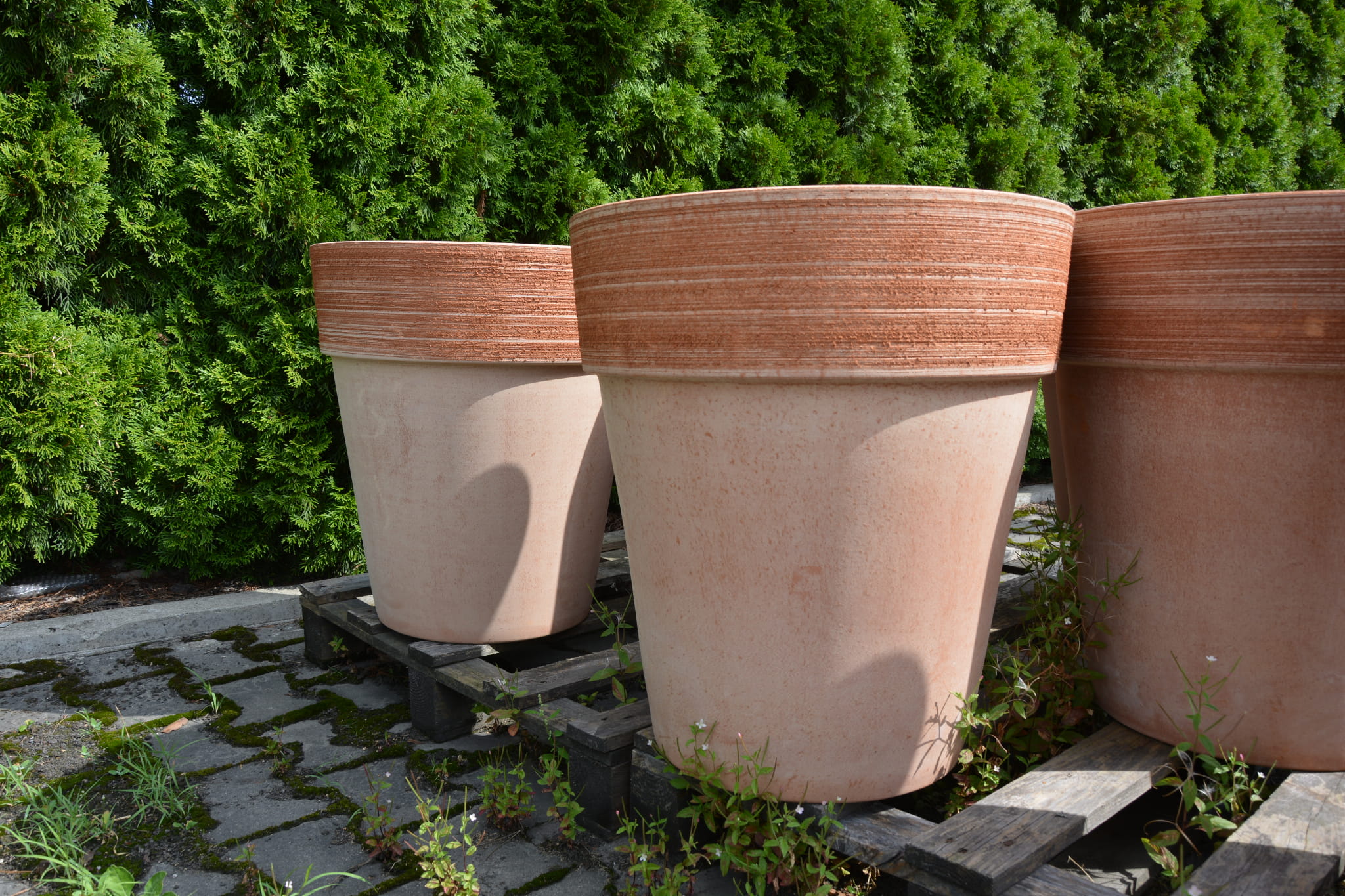 Włoska donica ogrodowa o okrągłej podstawie wykonana z terakoty.