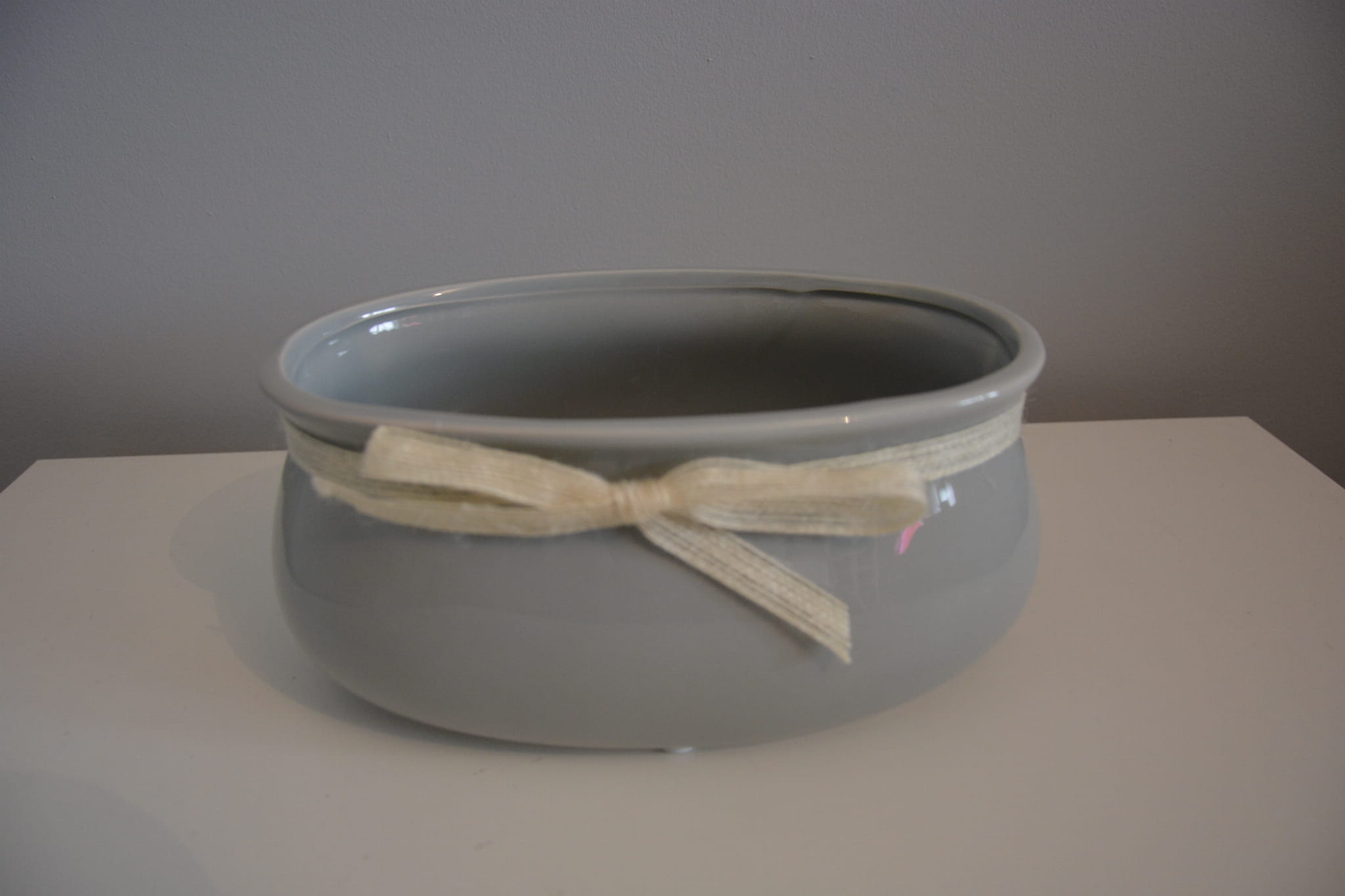 Owalna doniczka ceramiczna ze wstążką.