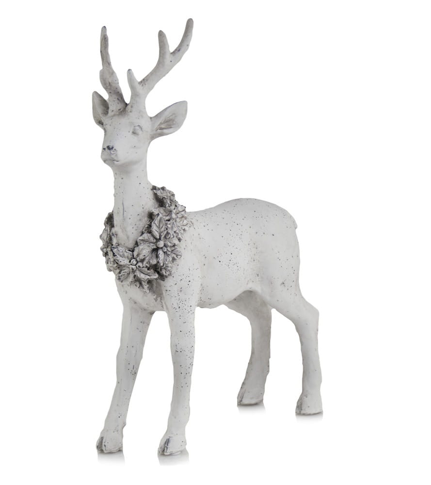Klasyczny bożonarodzeniowy renifer przywołujący swoim nostalgicznym wyglądem najpiękniejsze wspomnienia świąteczne. Renifery są nieodłącznym symbolem świat Bożego Narodzenia, kojarzą się nam wszystkim z zaprzęgiem św. Mikołaja pełnym prezentów. Otacza je magiczna aura związana nie tylko ze świętami, ale również z ich surowymi warunkami życia w „krainach wiecznych śniegów”. Co powoduje, że postrzegane są jako zwierzęta silne, dumne, wytrzymałe i wyjątkowe. Figurka ma piękną, lekko postarzaną fakturę, dodatkowo renifera ozdabia delikatny, misterny wieniec na szyi. Dodający dostojeństwa i uroku. Renifer o kolorystyce w odcieniach szarości z ciemniejszymi kropkami. Ręczne wykonanie, dopracowane szczegóły powodują, że każdy renifer jest niepowtarzalny i jedyny w swoim rodzaju. Idealny do kompozycji bożonarodzeniowych zarówno tradycyjnych jak i nowoczesnych, pięknie prezentuje się również jako samodzielna dekoracja.